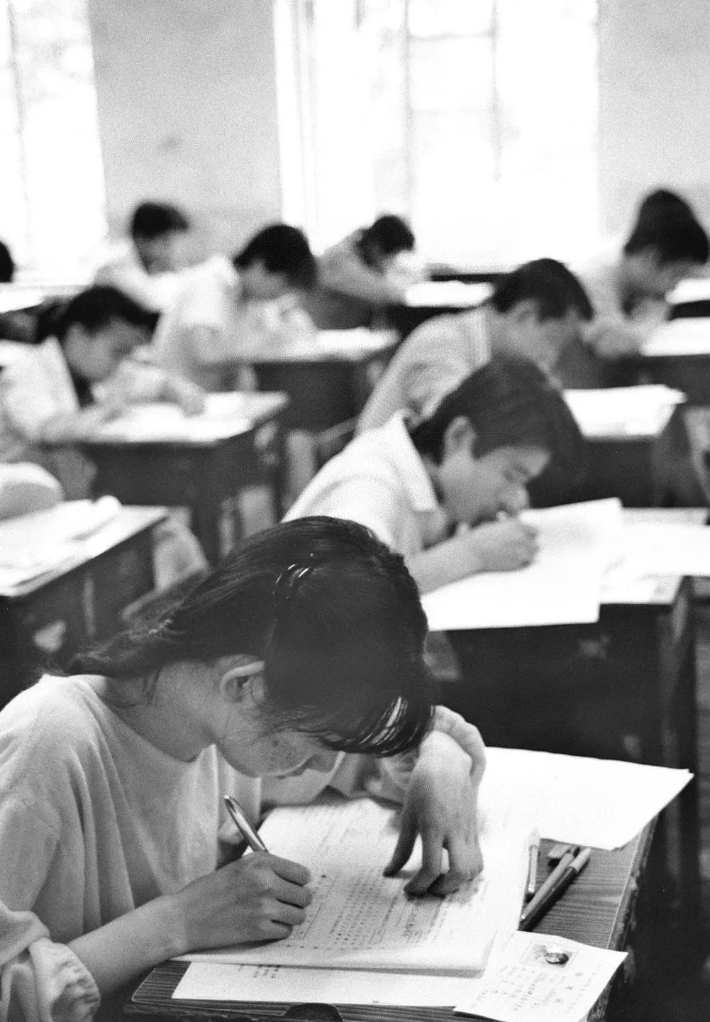▲1996年7月7日,全国普通高等学校招生考试进入第一天。北京四中考生在应试。1996年中国高等教育试行并轨招生,高校学费开始增加。(新华社记者 李俊东 摄)