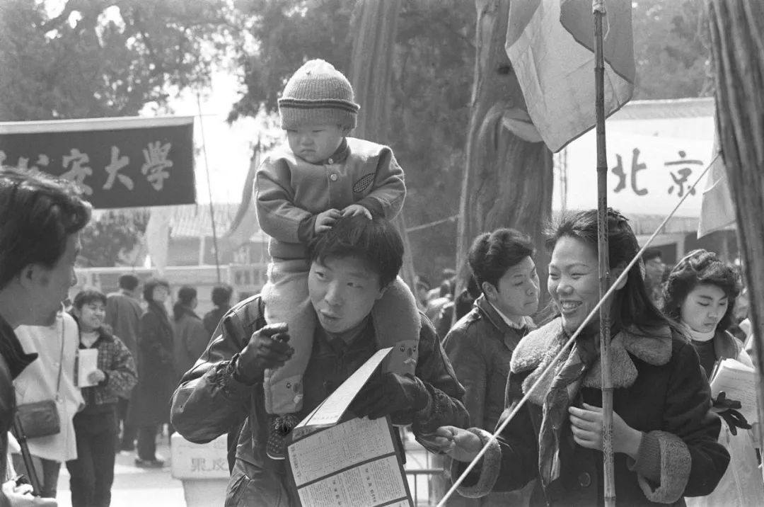 ▲1992年3月8日,北京4万多名考生前往北京劳动人民文化宫参加成人高考咨询活动。一位女青年想报考北京师范大学学前教育专业,丈夫特意带着孩子陪她前来咨询。(新华社记者 王呈选摄)
