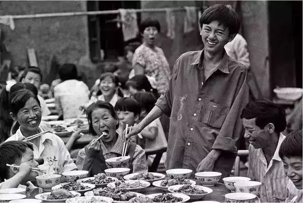 ▲1994年,湖北三峡坝区三斗坪镇东岳庙村黎开英的儿子望军在全国高考中,以651分的好成绩考入清华大学汽车工程系,乡亲们纷纷来到他家祝贺,望军不停地给大家夹菜以示感谢。(新华社发)