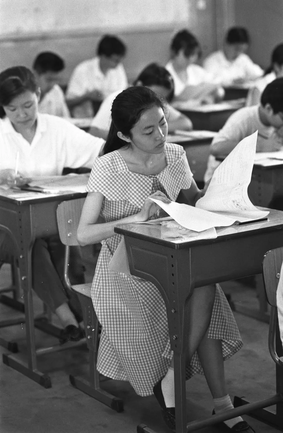 ▲1989年7月7日,北京市第五中学的一个考场内,考生正在答题。1989年北京市共有34841人参加了文史、理工和外语3个科类的考试。(新华社记者 杜捷 摄)