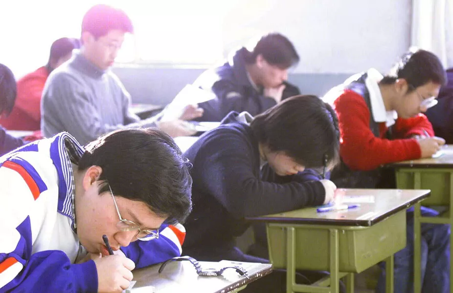 ▲2000年1月19日,北京和安徽两地春季高考开考。大约3.6万名两地考生参加了此次高考。图为考生在北京市第六十二中学考场参加考试。( 新华社记者 高学余 摄)