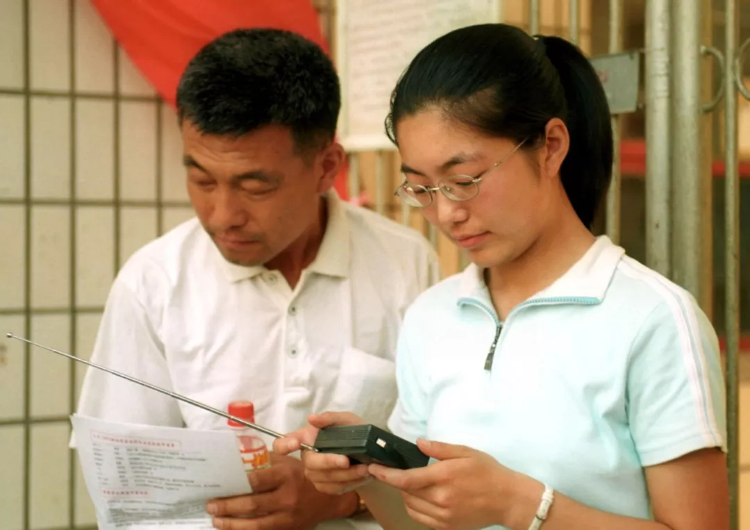 ▲2002年7月8日下午,北京举行高考英语听力测试。试题通过北京广播电台新闻台中波828千赫和调频100.6兆赫两个频率播放。听力测试成绩将首次计入高考英语总成绩。这是2003年将参加高考的王俊由父亲陪同在考场外提前感受听力考试气氛。李石磊 摄 (新华社发)