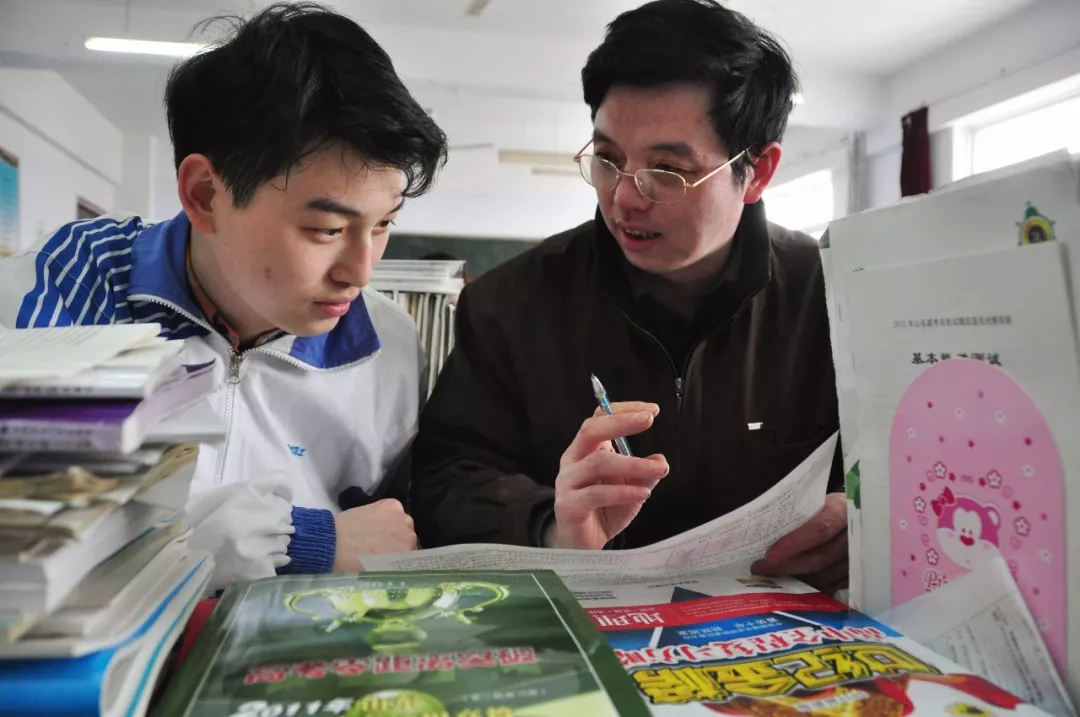 ▲2011年3月14日,在课间,父亲王宝峰(右)与儿子王旭东(左)相互交流学习体会。家住山东省滨州市滨城区王宝峰与儿子王旭东刚刚参加完近一个月的美术专业课考试后,重返滨城区职教中心艺术复读班,进行文化课程的冲刺学习。2001年4月3日,教育部公布了高考招生制度改革又一项新举措,即2001年高考中报考普通高校考生的年龄、婚否不限。(新华社发)