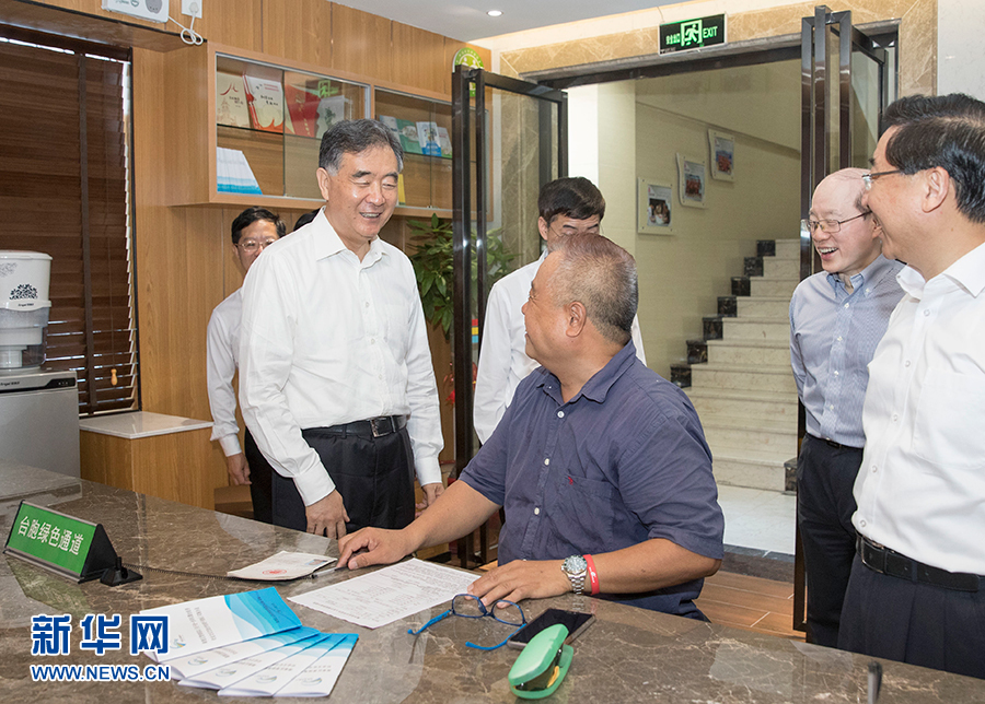 6月6日至7日,中共中央政治局常委、全国政协主席汪洋在厦门出席第十届海峡论坛期间,就两岸经济文化交流合作情况进行调研。这是6月7日,汪洋在厦门市湖里区殿前街道兴隆社区便民服务大厅了解台胞在闽生活工作情况。新华社记者 王晔 摄