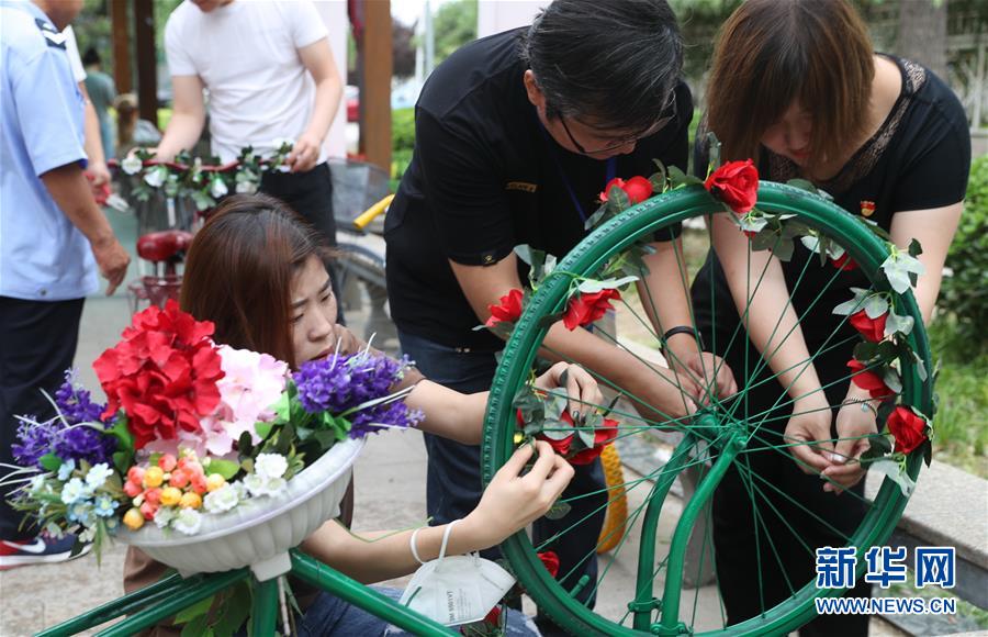 6月9日,丰台区花乡天伦锦城社区居民们在装饰废旧自行车。