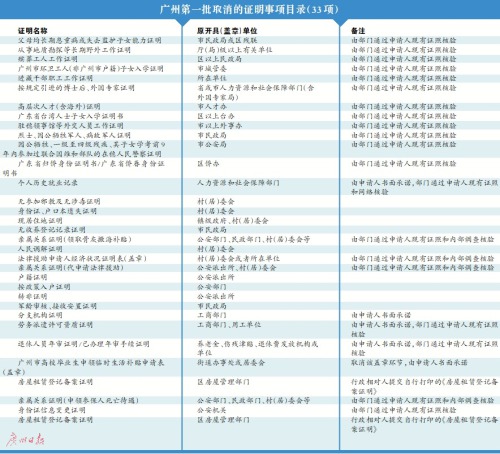 据悉,广州自去年10月起已启动“减证便民”专项工作,由市编办牵头,会同市法制办、市政务办对市政府各部门的证明事项进行梳理审核。经研究,市政府第一批取消7个部门共33项证明事项,其中市教育局13项、市人力资源社会保障局10项、市公安局4项、市司法局3项、市民政局1项、市交委1项、市食品药品监管局1项。