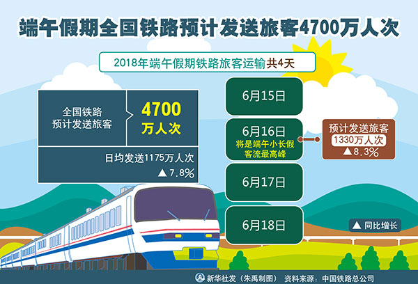 新华社北京6月13日电(记者樊曦)记者13日从中国铁路总公司获悉,为期4天的2018年端午假期铁路旅客运输将于6月15日启动,全国铁路预计发送旅客4700万人次。