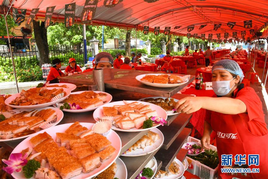 6月14日,工作人员在广州天河区珠村七夕广场准备龙舟饭。当日,广州市天河区举行一场热闹欢快的龙舟活动,来自多个村庄“走亲戚”的龙舟队参加。按广州的传统习俗,每年农历五月初一至初五,各村的龙舟队要到周围村落“走亲戚”。走亲戚的龙舟队到来时,受访村子要准备好龙舟饭招待来客。活动当天,鸣炮敲锣,一派喜庆气氛。新华社记者 邓华 摄