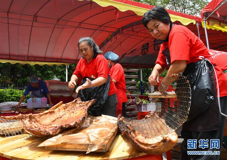 6月14日,工作人员在广州天河区珠村七夕广场准备龙舟饭。当日,广州市天河区举行一场热闹欢快的龙舟活动,来自多个村庄“走亲戚”的龙舟队参加。按广州的传统习俗,每年农历五月初一至初五,各村的龙舟队要到周围村落“走亲戚”。走亲戚的龙舟队到来时,受访村子要准备好龙舟饭招待来客。活动当天,鸣炮敲锣,一派喜庆气氛。新华社记者 邓华 摄