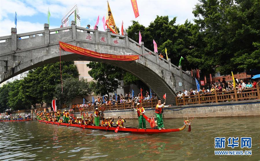 6月14日,多个村的龙舟队在广州市天河区一处河道划龙舟。当日,广州市天河区举行一场热闹欢快的龙舟活动,来自多个村庄“走亲戚”的龙舟队参加。按广州的传统习俗,每年农历五月初一至初五,各村的龙舟队要到周围村落“走亲戚”。走亲戚的龙舟队到来时,受访村子要准备好龙舟饭招待来客。活动当天,鸣炮敲锣,一派喜庆气氛。新华社记者 邓华 摄