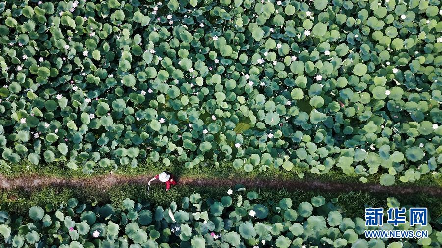 6月14日,游客在铜陵市西湖村荷花园内赏荷(无人机拍摄)。随着气温升高,安徽省铜陵市西联镇西湖村荷花园内的300多亩荷花绚丽绽放,吸引游客前来赏荷。 新华社记者 张端 摄