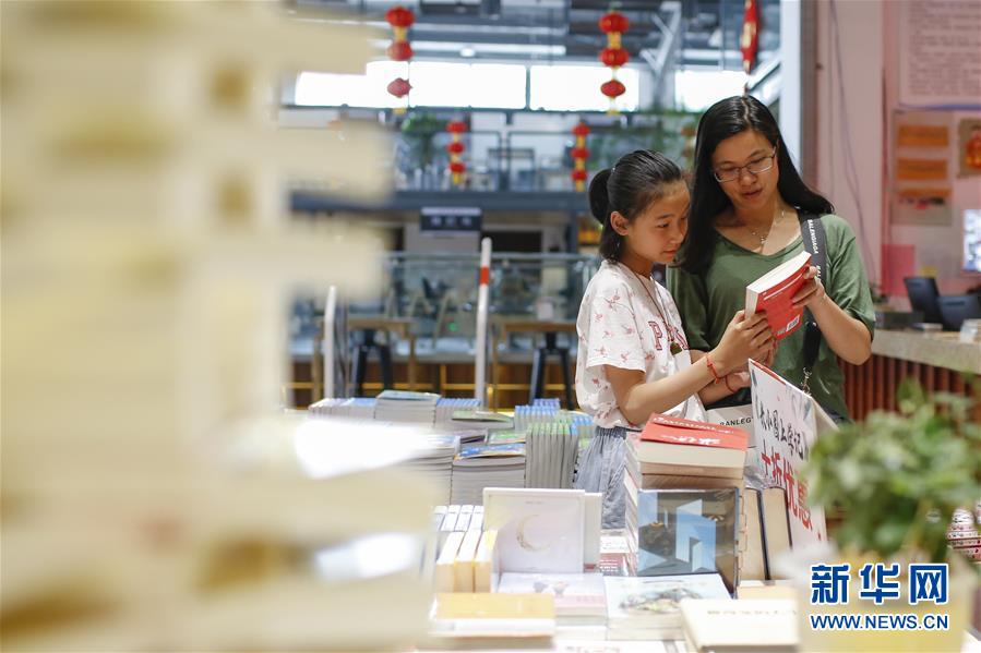 6月18日,小朋友和家长在江苏淮安盱眙县南岸书吧选购图书。 新华社发(颜怀峰 摄)