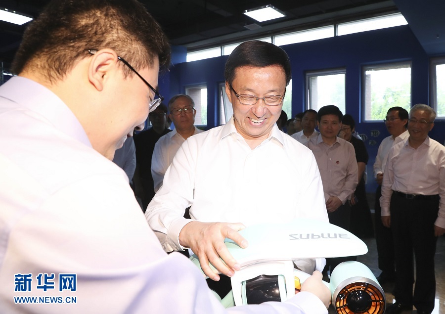 6月19日,中共中央政治局常委、国务院副总理韩正在天津市调研京津冀协同发展工作。这是韩正考察天津深之蓝水下新视界科技有限公司。新华社记者 丁林 摄