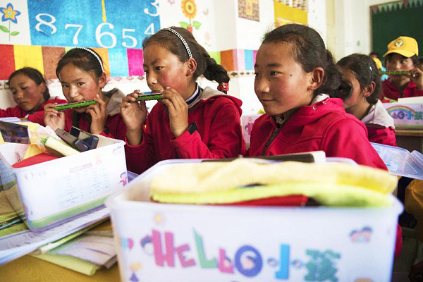 6月20日,甘肃省甘南藏族自治州夏河县吉仓乡中心寄宿制小学的孩子拿起“HELLO小孩”爱心套餐包内的口琴试吹。当日,由中国儿童少年基金会携手爱心企业开展的“HELLO小孩”公益项目走进甘肃省甘南藏族自治州夏河县吉仓乡中心寄宿制小学,向每一位孩子发放了包括文具、衣物、乐器等在内的“HELLO小孩”爱心套餐包,并为孩子进行心理健康辅导,帮助他们健康快乐成长。