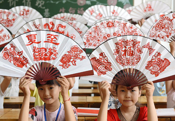 6月20日,山东省临沂市沂南经济开发区实验学校的孩子们在展示亲手制作的“剪纸扇子”。夏至来临,孩子们在老师指导下制作“剪纸扇子”,感受传统文化的魅力。