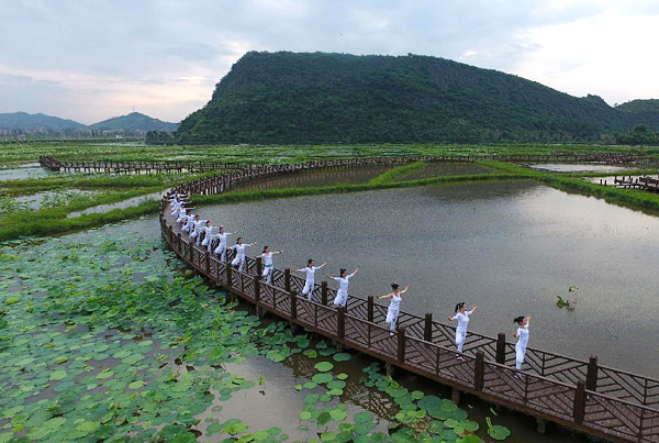6月20日,湖南省永州市道县的瑜伽爱好者在周敦颐故里清塘镇楼田村荷田旁晨练。联合国于2014年宣布6月21日为国际瑜伽日,旨在提高人们对于练习瑜伽可以带来诸多益处的认识。