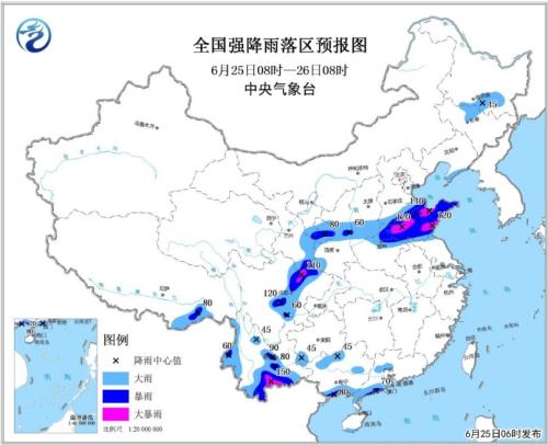 预计25日08时至26日08时,山东大部、河南北部、河北南部、山西南部、广西南部沿海和北部、广东西南部沿海和北部、四川盆地西部和北部、云南西部和中南部、贵州西南部、甘肃东部和南部、宁夏南部、陕西中部等地的部分地区有大雨或暴雨,局地大暴雨(100~150毫米);上述部分地区伴有短时强降水(最大小时降水量40~60毫米,局地70毫米以上)。此外,辽东半岛、黑龙江南部、吉林中西部等地有大雨,局地并伴有雷暴大风等强对流天气。为此,中央气象台6月25日06时继续发布暴雨蓝色预警。