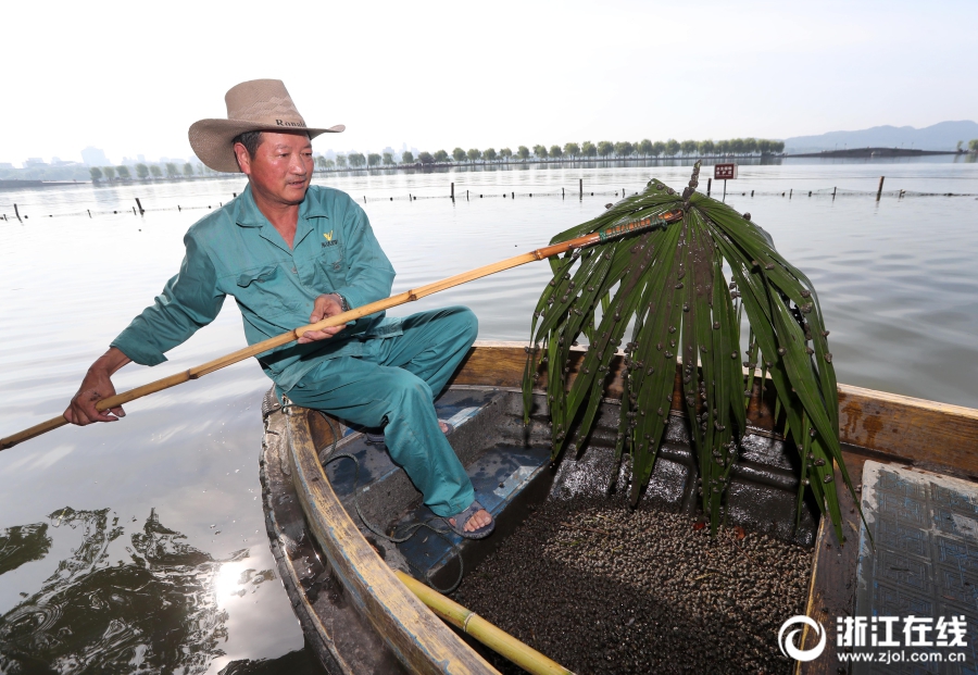 6月26日,杭州西湖水域管理处的工作人员正在北里湖用棕叶打捞水底的螺蛳。由于西湖水底螺蛳密度过大,对水生植物生长造成影响,西湖水域管理处使用了新武器,把粽叶放入水底,让螺蛳爬到粽叶后再捕捞。据悉,这是浙江伟大园林公司几个研究生想出的新办法,截至6月26日已经试验4天,每天可清理螺蛳五六十斤。((浙江在线记者 王坚颖 林云龙 汪驰超 摄))