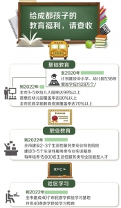 在增加教育公共服务供给方面,成都市全面实施中心城区中小学、幼儿园“三年攻坚”行动计划,至2020年计划建设中小学、幼儿园536所,增加学位约28万个,满足市民公共教育服务需求。进一步扩大学前教育资源总量,鼓励扶持普惠性幼儿园。到2022年,全市3-5岁幼儿入园率达99%以上,普惠性幼儿园覆盖率(公办幼儿园和普惠性民办幼儿园在园幼儿数占在园幼儿总数的比例)达80%以上,全市优质学前教育资源覆盖率(二级园以上在园幼儿数占在园幼儿总数的比例)达70%以上。