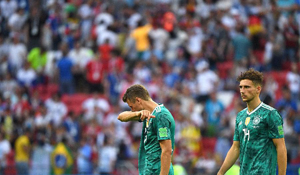 2018年世界杯一场小组生死战6月27日上演,德国队以0:2不敌韩国队,无缘16强。韩国队金英权和孙兴民在补时阶段完成绝杀,将卫冕冠军送回了家。这是自1938年世界杯,时隔80年后,德国队再次未能小组出线。这也是世界杯历史上第六次出现卫冕冠军止步小组赛。图为6月27日,德国队球员穆勒(左)在小组赛德国队负于韩国队后哭泣。