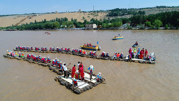 6月27日,歌手在羊皮筏子上对唱西北民歌“花儿”(无人机拍摄)。当日,“情系母亲河——皮筏对歌唱响家乡情”活动在宁夏中卫市沙坡头景区举行。两队羊皮筏子在蜿蜒的黄河上组成了移动舞台,表演者用西北特有的演唱方式“花儿”演绎宁夏风土人情,引得游客驻足观看。