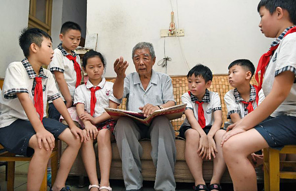 6月27日,退伍老军人焦克明(中)向孩子们讲述战争年代的红色故事。 “七一”前夕,江西省南昌市西湖区骆家花园社区的孩子们来到退伍老军人焦克明的家中,聆听红色故事,感悟革命精神。