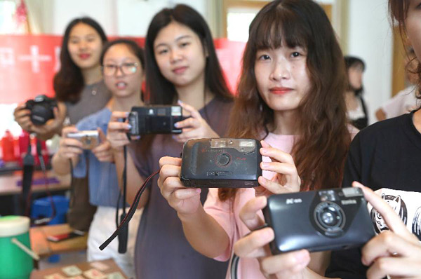 6月27日,江苏省镇江市江苏科技大学的青年学生展示老款相机。 当日,金山街道润州山路社区开展“改革开放40年老物件看新变化”主题活动。活动邀请江苏科技大学青年学生走进社区,和居民一起参观粮票、缝纫机、寻呼机、翻盖手机等老物件,一起感受百姓生活的变化。