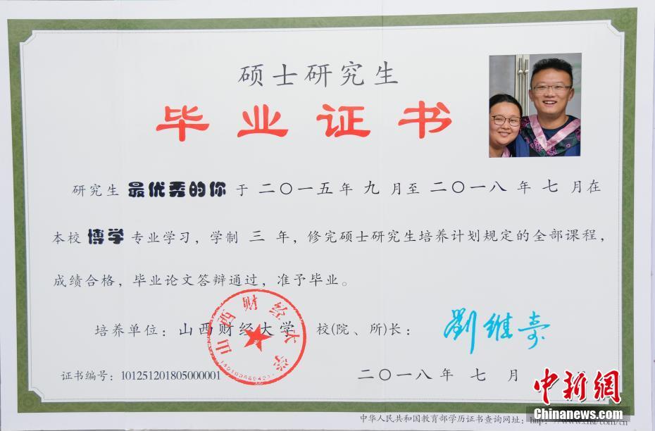 6月29日,山西太原,山西财经大学举行2018年研究生毕业典礼,情侣毕业生在创意毕业证书背景板后合影留念。中新社记者 武俊杰 摄