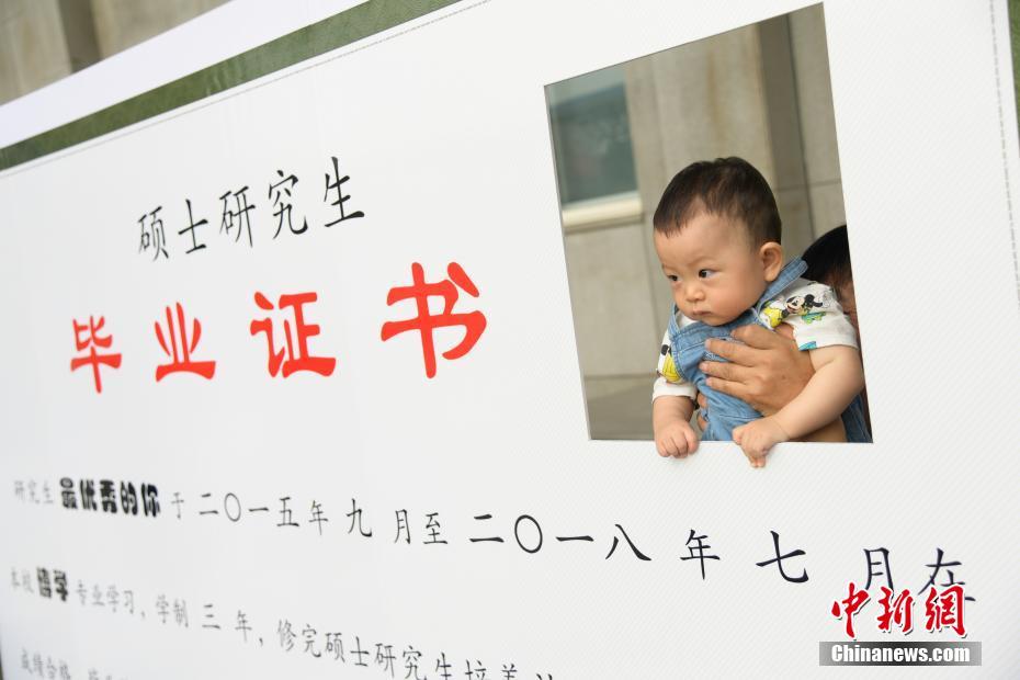 6月29日,山西太原,山西财经大学举行2018年研究生毕业典礼,毕业生携子在创意毕业证书背景板后合影留念。中新社记者 武俊杰 摄