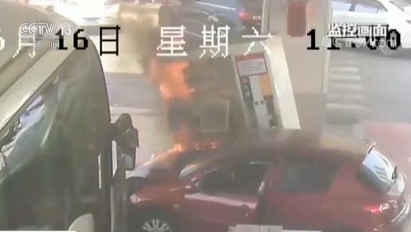 监控画面显示,6月16日上午11点左右,中石油长沙市岳麓大道加油站内,一辆红色轿车突然失控撞倒加油机,随即引发大火。