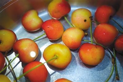 6月26日,盐水浸泡中的樱桃,没有发现小虫子。新京报记者 王嘉宁 摄