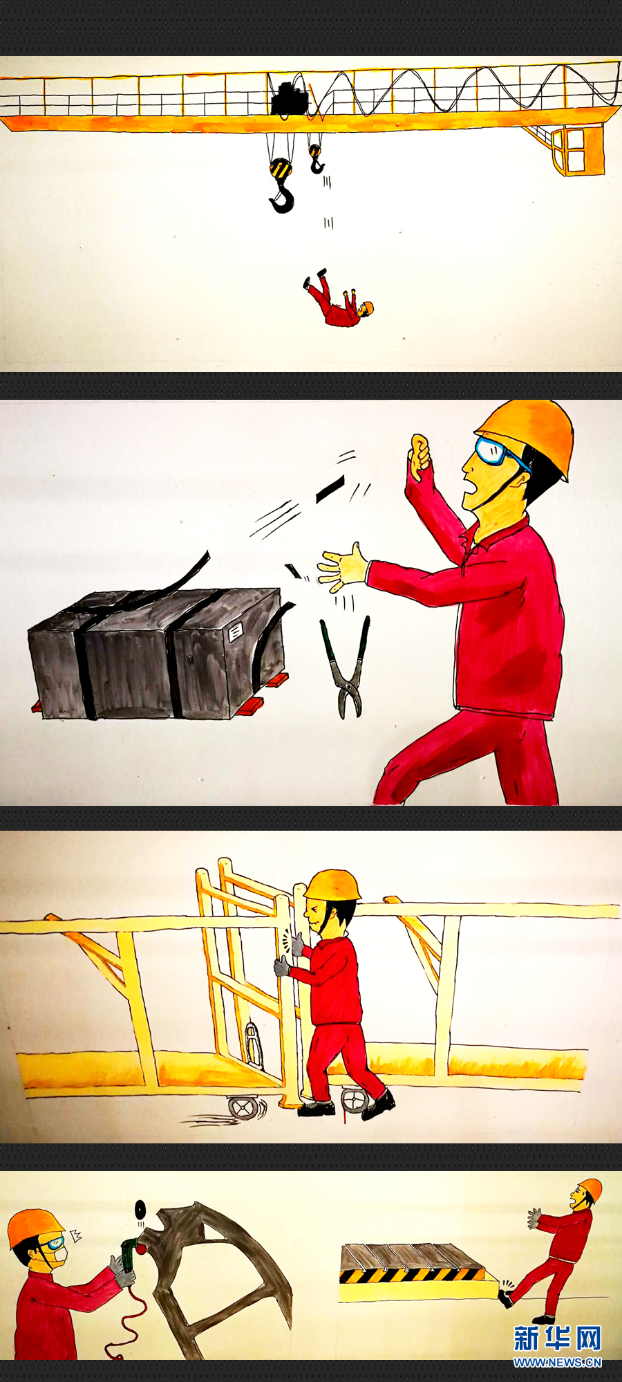 图为江淮乘用车冲焊车间有关安全生产的手绘图,用漫画形式生动表现生产生活中各种典型事故案例,对企业员工起到警示作用。 新华网 张明宇 摄