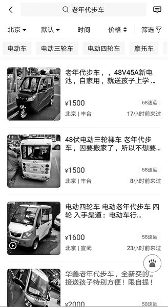 除了新车,北青报记者发现,在二手货交易平台上,北京本地的老年代步车等违规电动车也可以正常交易。