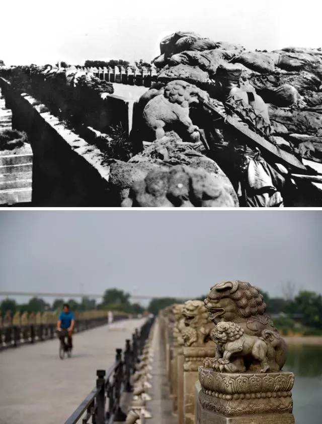 上图为守卫卢沟桥的29军士兵抵抗日本侵略军入侵(资料照片);下图为2017年7月3日拍摄的卢沟桥(新华社记者 张晨霖 摄)。
