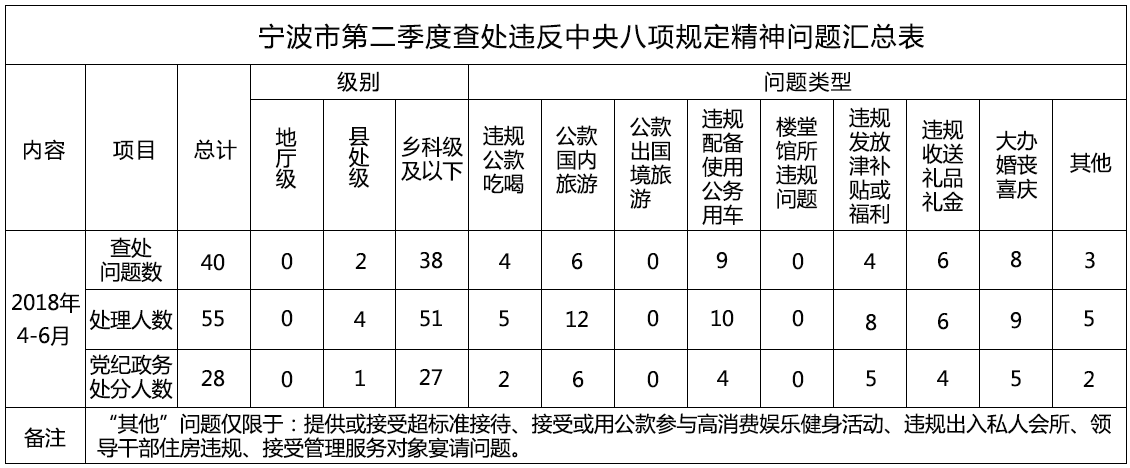 2018年4至6月,宁波市各级纪检监察机关共查处违反中央八项规定精神问题40起,处理55人,其中给予党纪政务处分28人。