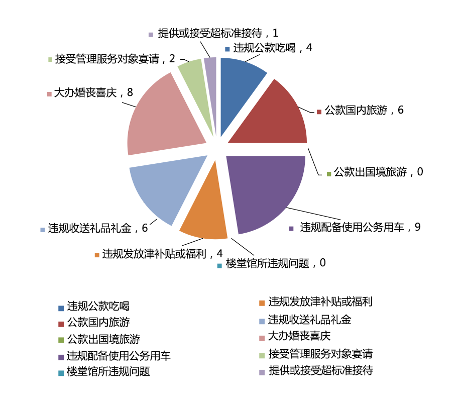 从查处问题类型看,违规问题数量较多的分别是违规配备使用公务用车问题(9起)、大办婚丧喜庆问题(8起),公款国内旅游问题(6起)、违规收送礼品礼金问题(6起),这四类问题占查处总数的72.5%;从处理干部级别看,查处县处级干部4人,占7.3%;乡科级及以下干部51人,占92.7%。(宁波市纪委监委)