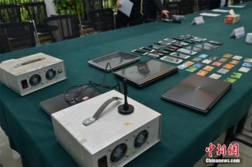 资料图:广东省公安厅内展示的涉电信诈骗犯罪案中的作案工具。中新社发 陈骥旻 摄
