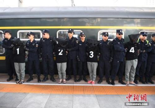 2017年8月29日,长春火车站,10名电信诈骗犯罪嫌疑人被长春警方从国外经云南押解回国。中新社记者 张瑶 摄