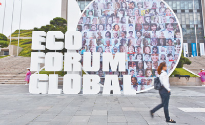 图为7日与会嘉宾从贵阳国际生态会议中心的生态文明贵阳国际论坛标识前经过。新华社发