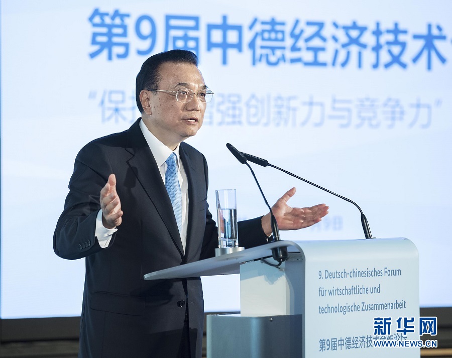 李克强表示,中德合作保持全面稳定健康发展态势,长期引领中欧合作,堪称大国合作的典范,为两国乃至世界经济发展注入了动力。习近平主席去年对德国进行成功访问,同德方领导人共同规划两国关系发展。我与默克尔总理今天共同主持第五轮中德政府磋商,达成重要共识。我们一致同意继续巩固和提升政治互信,夯实中德全方位战略伙伴关系的基础,推动两国合作向更高水平迈进,以中德合作的确定性、维护多边主义的一贯性为世界和平与发展增添稳定性。