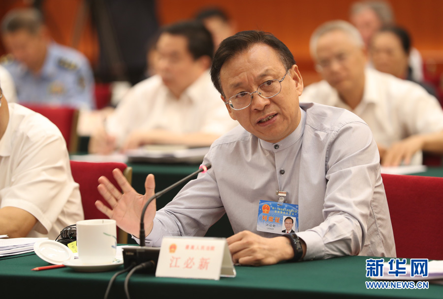 7月10日上午,十三届全国人大常委会第四次会议举行联组会议,就大气污染防治法执法检查报告进行专题询问。图为最高人民法院副院长江必新回答问题。新华网 郭小天 摄