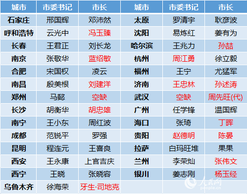 14个省会城市调整书记市长 两个“一把手”职务空缺待补