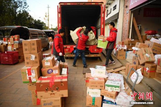 工作人员将分拣后的商品装车。中新社记者 刘冉阳 摄