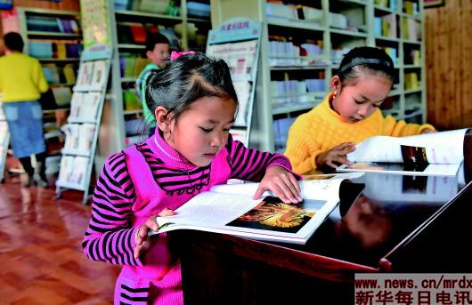 两名银井小学的缅甸小学生在瑞丽市姐相乡银井“一寨两国”国门书社里看缅文杂志(2015年1月15日摄)。