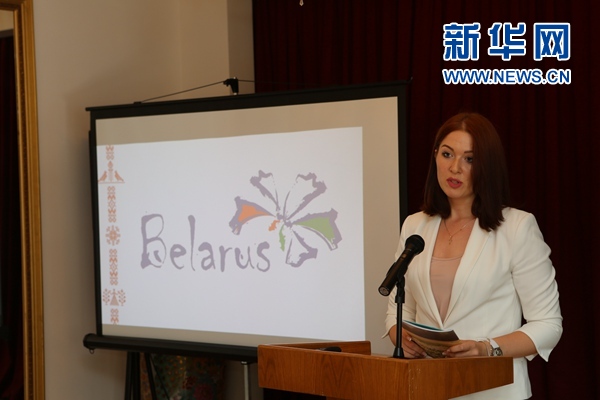 7月11日,在白俄罗斯首都明斯克,一位白俄罗斯企业代表在中国国际进口博览会白俄罗斯推介沟通会上推介本国产品。新华社记者魏忠杰 摄
