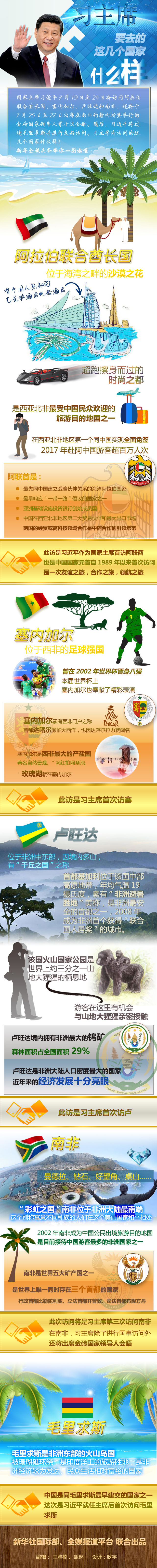 季夏之月,赴万里之约。7月19日至28日,习近平主席将对阿联酋、塞内加尔、卢旺达和南非进行国事访问,出席在南非约翰内斯堡举行的金砖国家领导人第十次会晤,过境毛里求斯并进行友好访问。