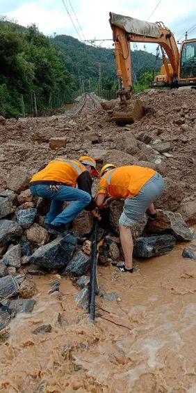 14日凌晨3点,经过将近3小时、8公里的徒步行走,刘金乐终于到达横现河水害处所。他二话不说,拿起铁锹带领大家清理排水沟,用矿泉水瓶、棉纱清理箱盒内部积水。