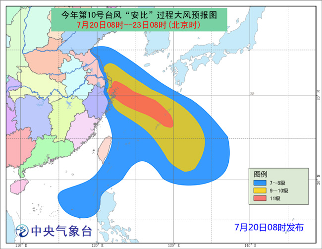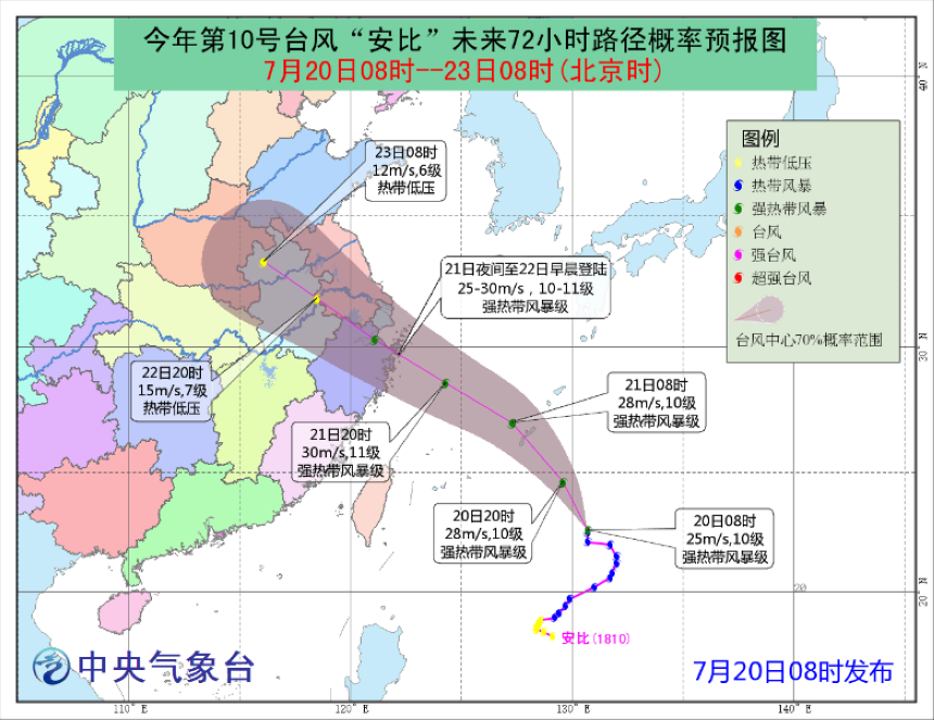董林:今年第10号台风“安比”20日上午加强为强热带风暴级,20日14时位于距离浙江省象山县东南方向约1100公里的海面上,预计将以每小时25公里左右的速度向西北方向移动,21日早晨进入东海东南部,强度继续加强,最强可达强热带风暴级或台风级(11~12级,30~35米/秒),21日夜间到22日早晨在浙江温岭到江苏启东一带沿海登陆(强热带风暴级,10~11级,25~30米/秒)。登陆后将继续向西北方向移动,强度逐渐减弱。