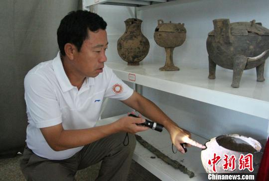 图为考古人员在大韩东周墓地的一墓葬内发现青铜鼎。赵晓 摄
