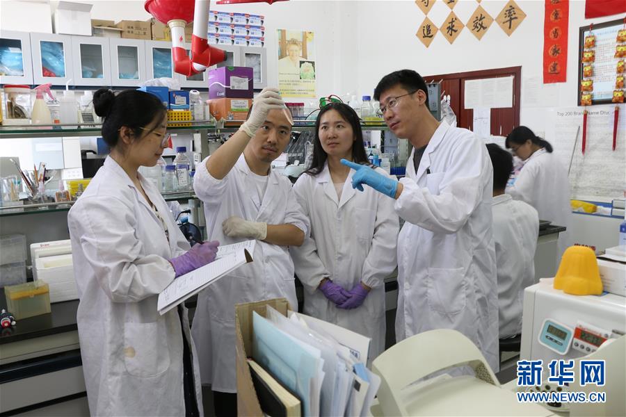 7月13日,中科院合肥物质科学研究院研究员刘青松(左四)与同事们在实验室工作。 新华社发
